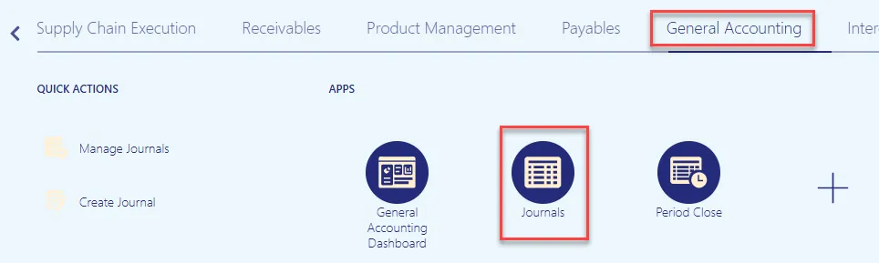 Step 2: From the Home page, click the General Accounting tab, then select the Journals application.