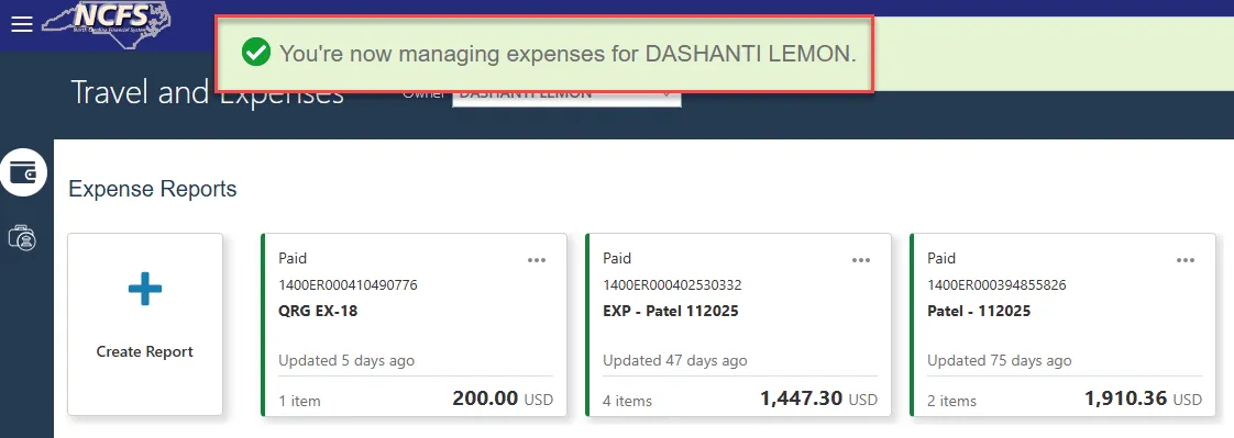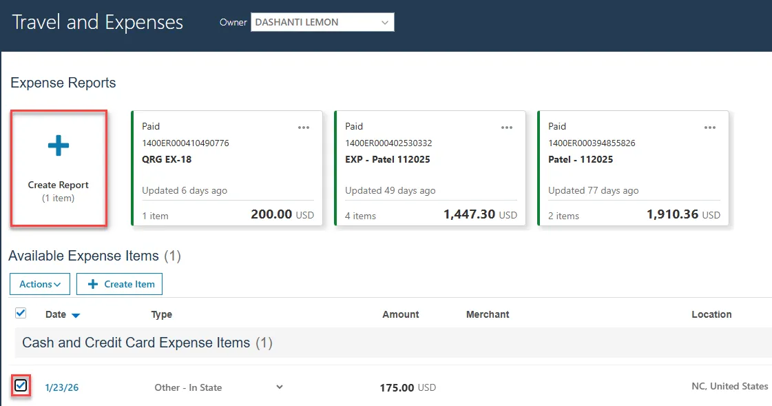 Step 21: Back on the Expense Reports page, select the expense item that was just created and click Create Report.