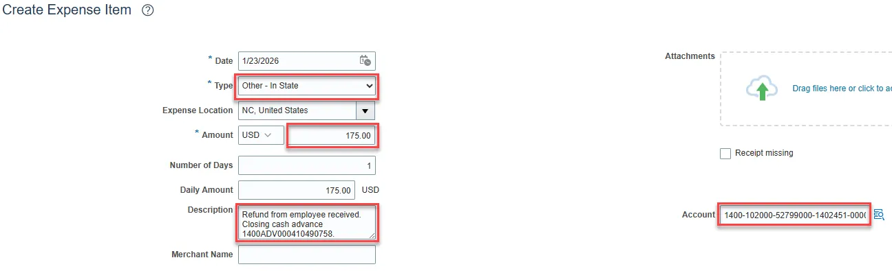Step 20: An expense item will need to be keyed to clear the remaining open portion of the cash advance. It is recommended to use the expense type of Other – In State.