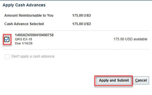 Step 26: A pop-up box will appear asking if you want to apply Cash Advances. Select the open Cash Advance in question and click Apply and Submit.