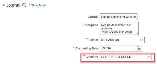 Step 5: For this particular journal, the Category will need to reflect a Deposit selection. The Category used for employee re-payments will typically be DEP – CASH & CHECK.