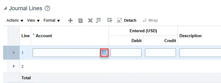 Step 6: Scroll down to the Journal Lines section and click the LOV picker icon.