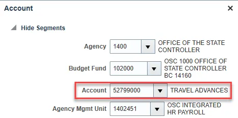 Note: A credit must be completed for the same account segment that is in the Cash Advance for the amount of the open/unapplied advance being closed.