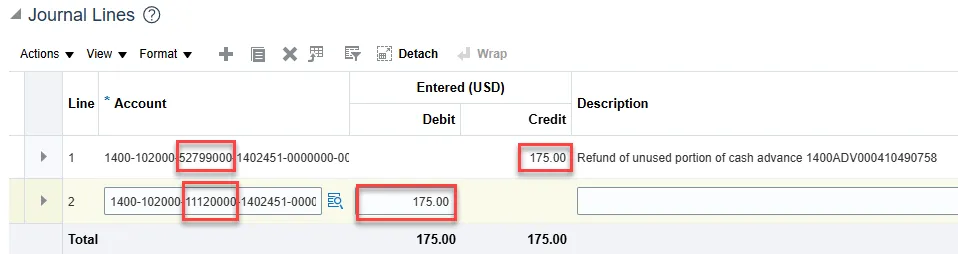 Step 8: Select segment value details in Journal Lines. For this example, we entered the amount of the open/unapplied cash advance that we are crediting back to the 52799000 Travel Advances account. You will also need to enter a corresponding debit line to cash account 11120000 Cash for the same amount.
