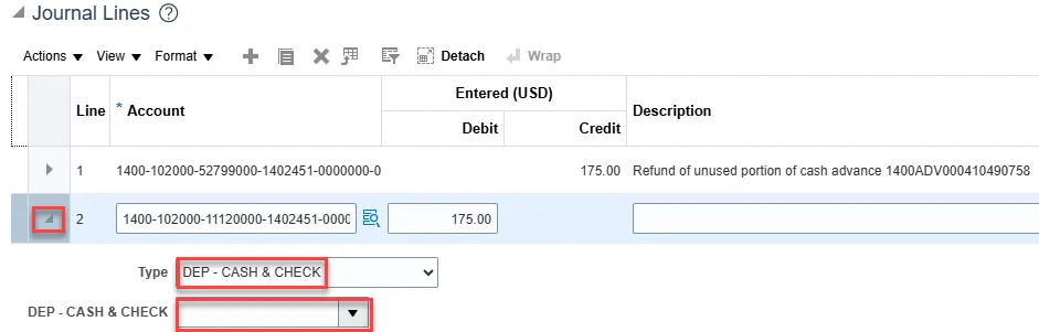 Step 9: When entering the corresponding debit line to cash account 11120000 Cash, the bank account number where the funds are deposited is also needed since this line will interface to DST. If the bank account number is not entered correctly then this will cause a bank reconciliation issue. To enter the bank account number, expand the cash line using the expand arrow.
