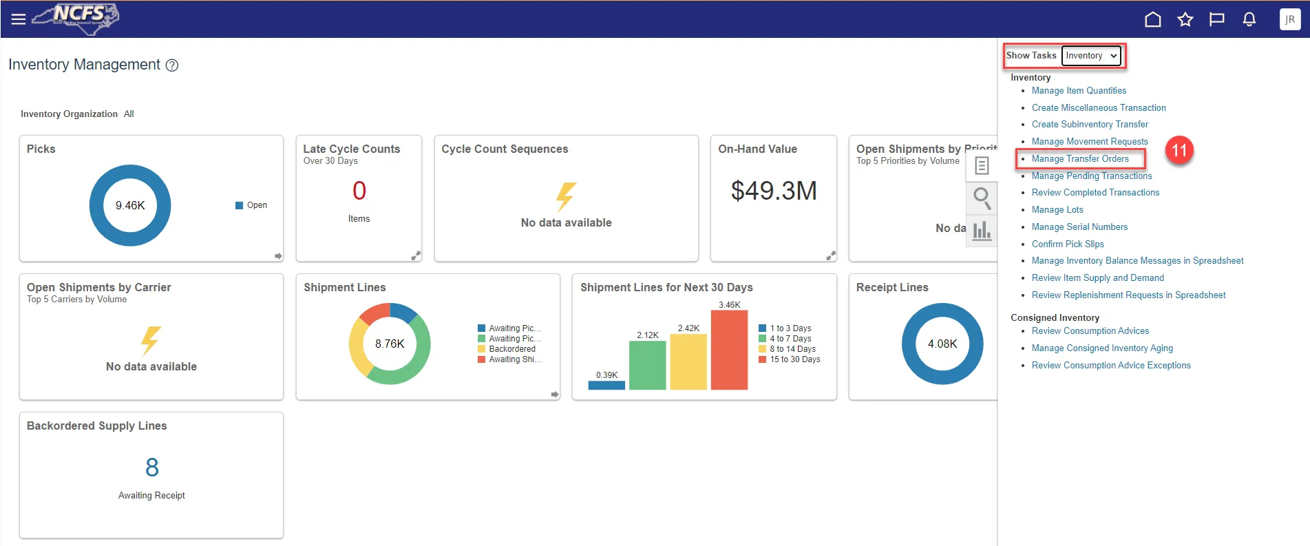 Step 11. Select Inventory under Show Tasks and then select Manage Transfer Orders.