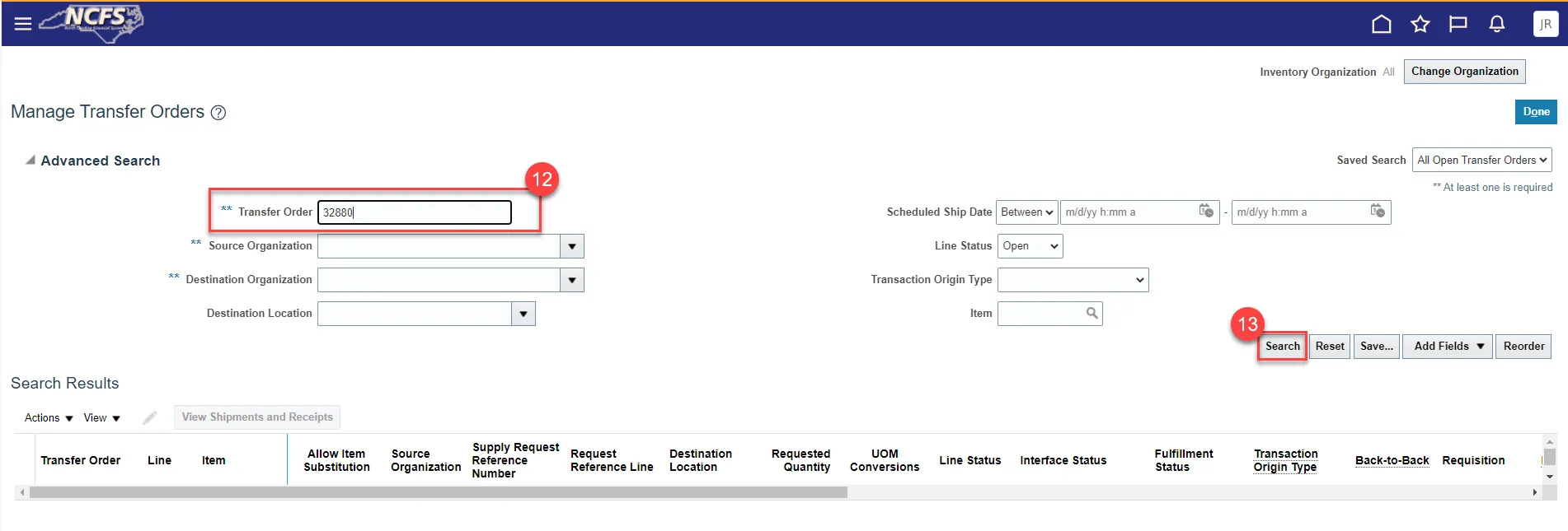Step 12. Enter the Transfer Order number in the Transfer Order field.