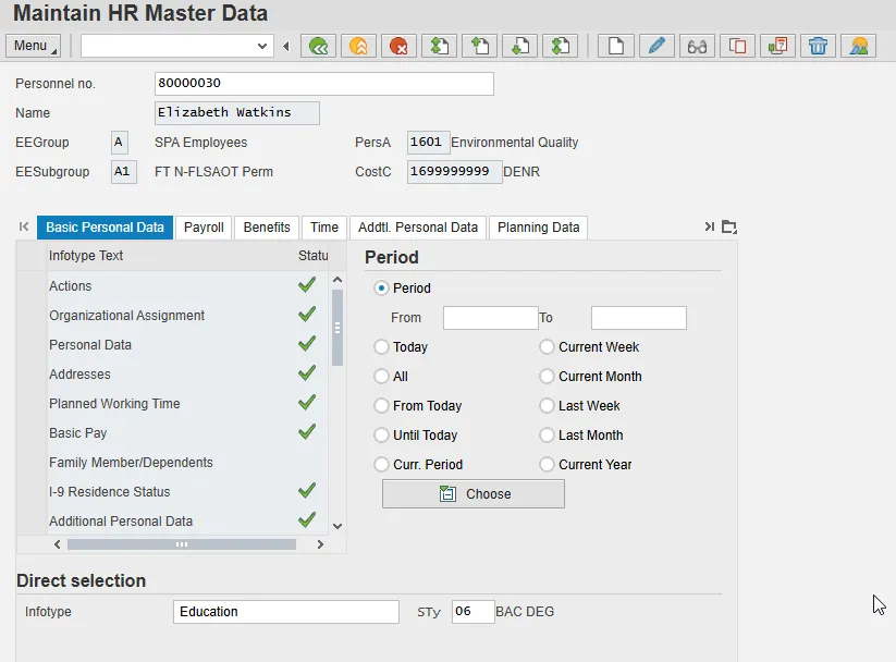 As a reminder, when an employee is hired, information on the Education infotype (0022) is entered to indicate that the education information is in pending status. The graphic below illustrates how infotype 0022 appears when the data is entered during the new hire process. The dates in the Start and to fields and the Institute/location field were entered based on the employee’s records. The Certificate field indicates that the verification of the information (a bachelor’s degree in this example) is pending.