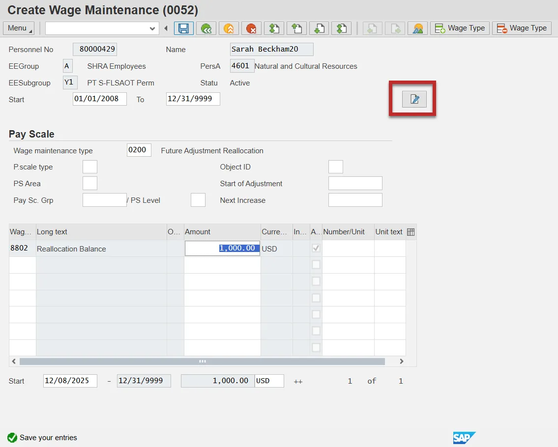 Step 10: Click the Save (Ctrl+S) button to save note. Back on the Create Wage Maintenance infotype, you will see the Maintain Text button displayed on the screen.