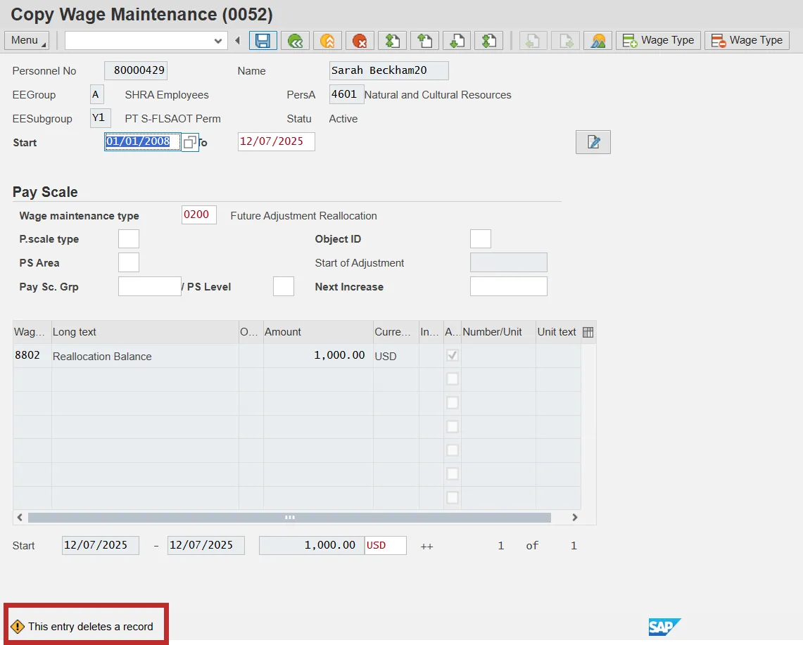 Step 13: Click Save at the Copy Wage Maintenance screen. You will receive a warning message indicating that “This entry deletes a record.”