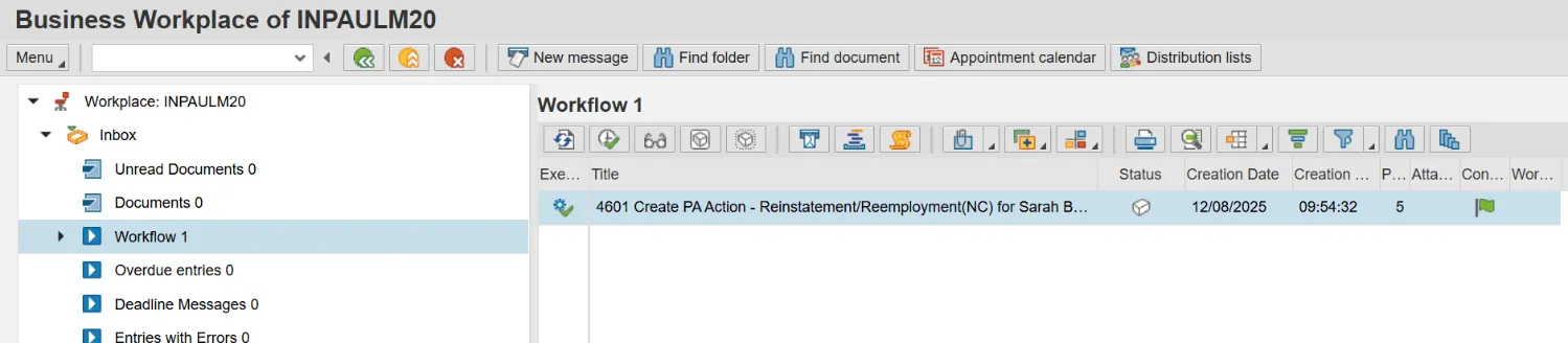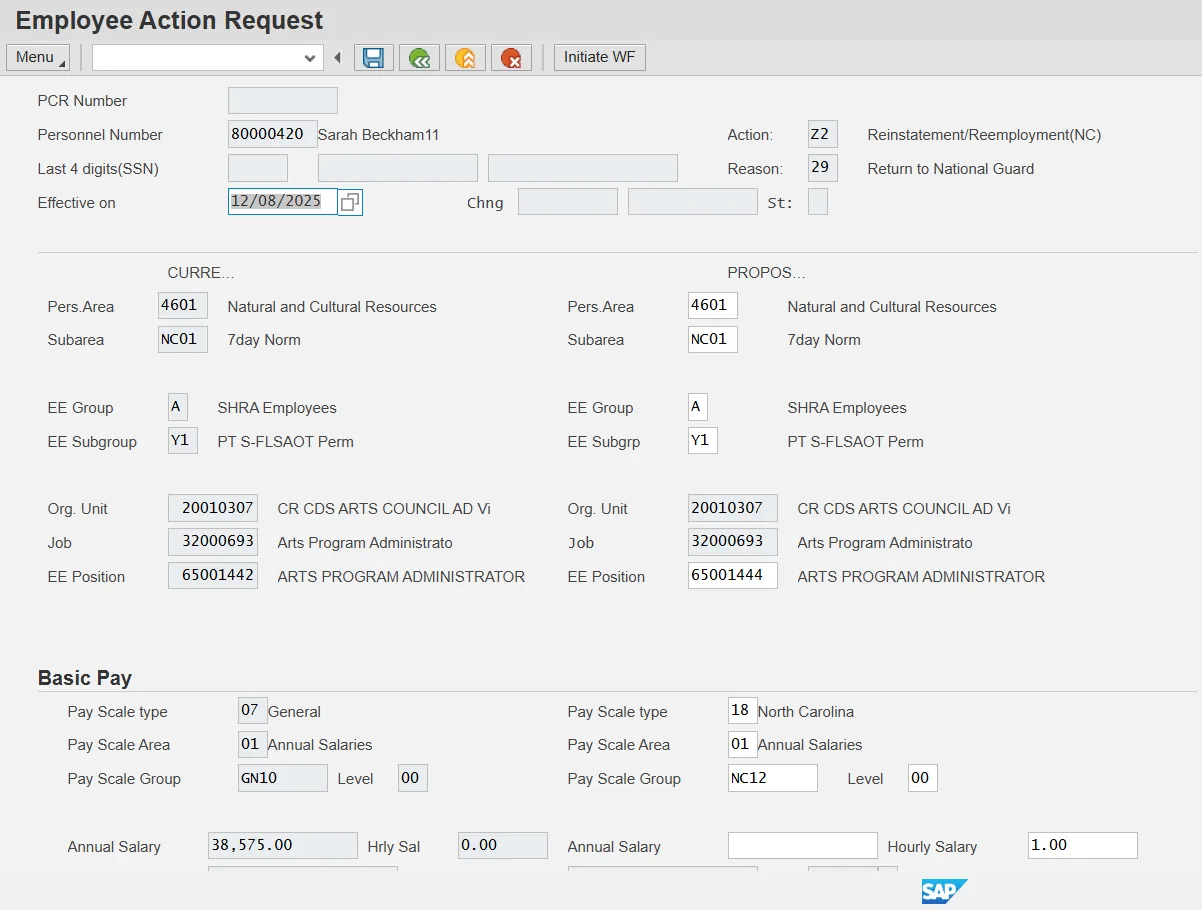 When you reach the Personnel Actions screen again, the system has processed all appropriate infotypes for the action you are creating. Now the action has been successfully processed, and you can complete the workflow.