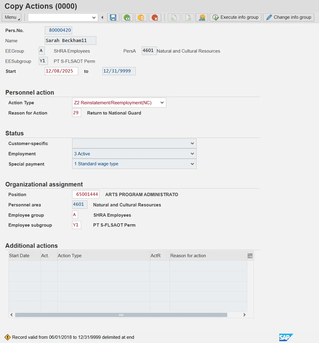 The Reinstatement/Reemployment Action is complete, but we recommend reviewing via PA20 all infotypes that have been processed.