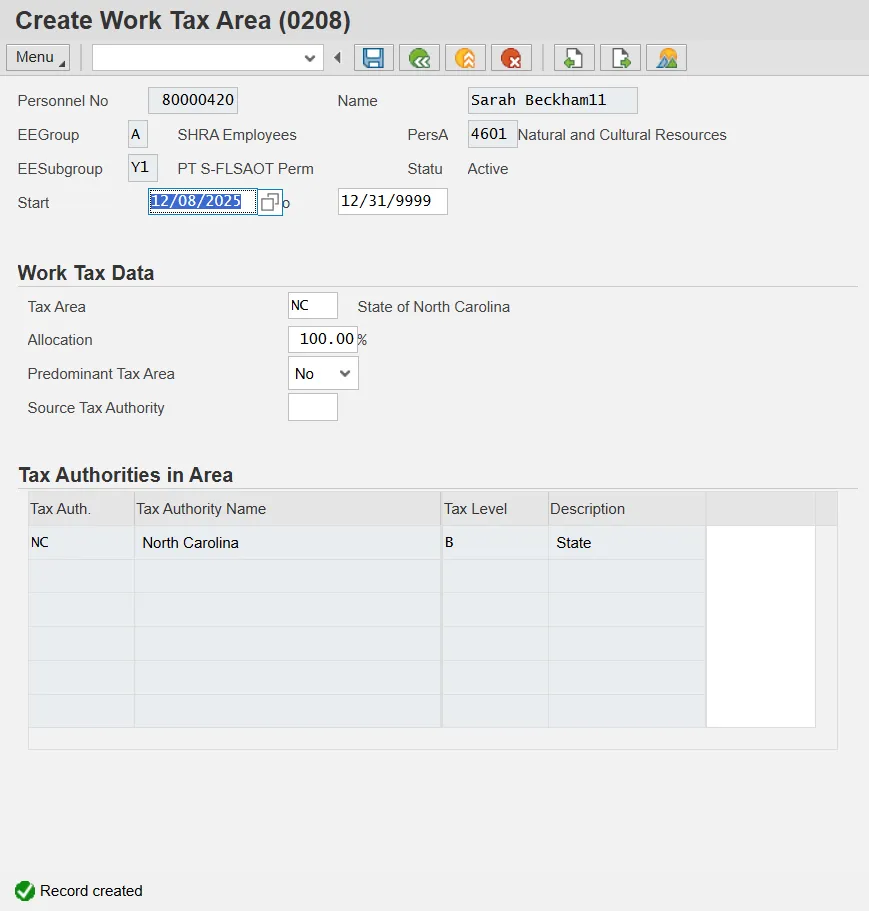Always verify that the default information on the Create Work Tax Area infotype is correct before saving.