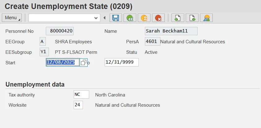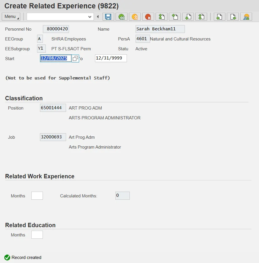 Notice at the top of this screen the title includes the word “Copy.”  This action takes the original action and makes a copy of it, delimiting the previous record and saving the new record. The word “Create” in the title indicates that this infotype is being created on this person's record for the first time.