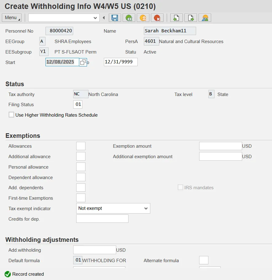 Step 47.    Create Withholding Info W4/W5 US (0210): Update fields as required.