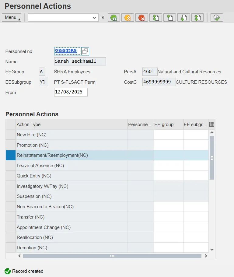 Step 23.    Highlight Reinstatement/Reemployment (NC) action type.
