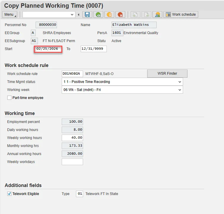 The Planned Working Time (Infotype 0007) has been updated to include a Telework Eligible field.  Once the Telework Eligible box is checked, the following Telework Option types are displayed: