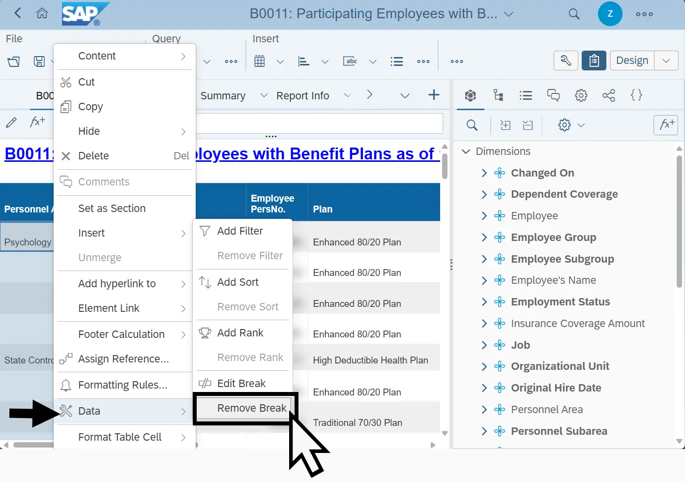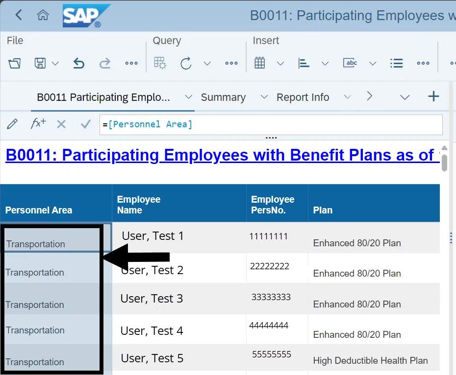 By default, breaks are applied in the report on Personnel Area, Employee Name and Employee PersNo. to avoid repeated values in the Columns.