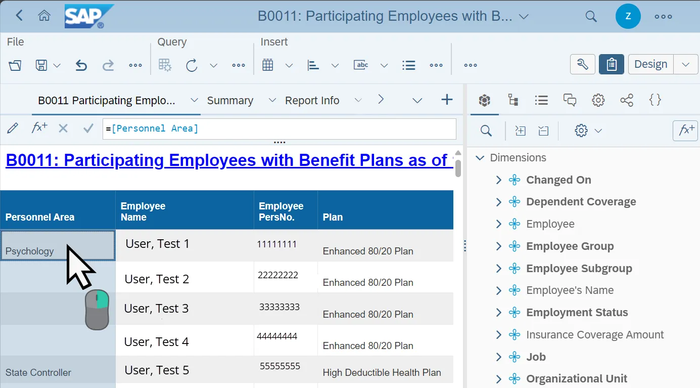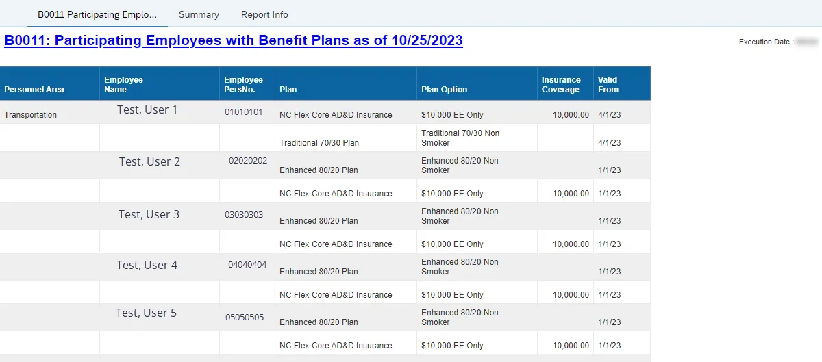 This report shows all employees who are participating in specified benefit plans as of the Selected Date and is associated with Two Reporting Views.