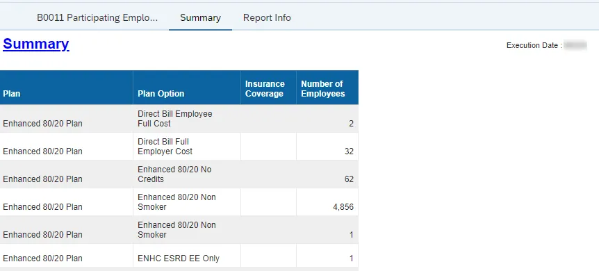 The Summary Reporting tab provides the summary of the Number of Employees by Plan and Plan Option.
