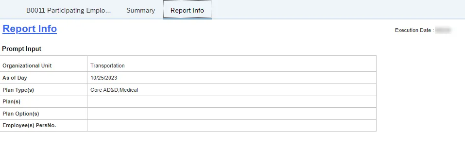 Report Info: The Report Info tab displays the information about the prompts entered.