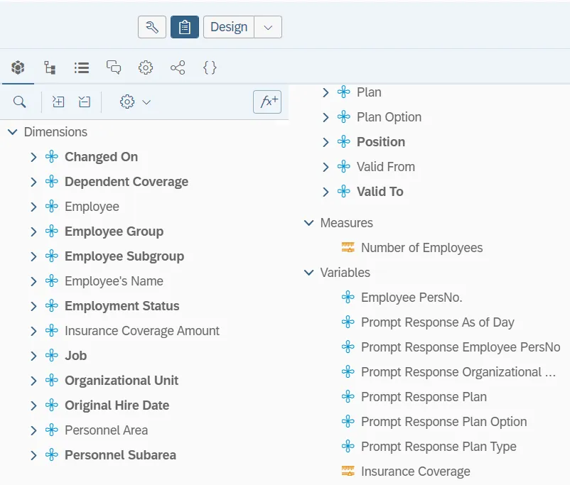 This is a list of the available objects that can be added to the report, from the Document Dictionary once in the Design mode: