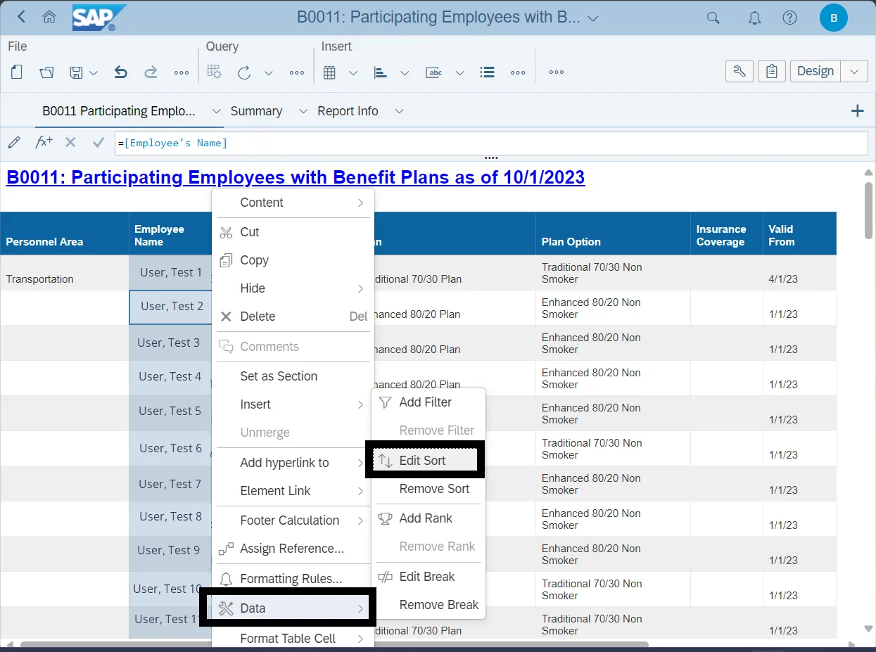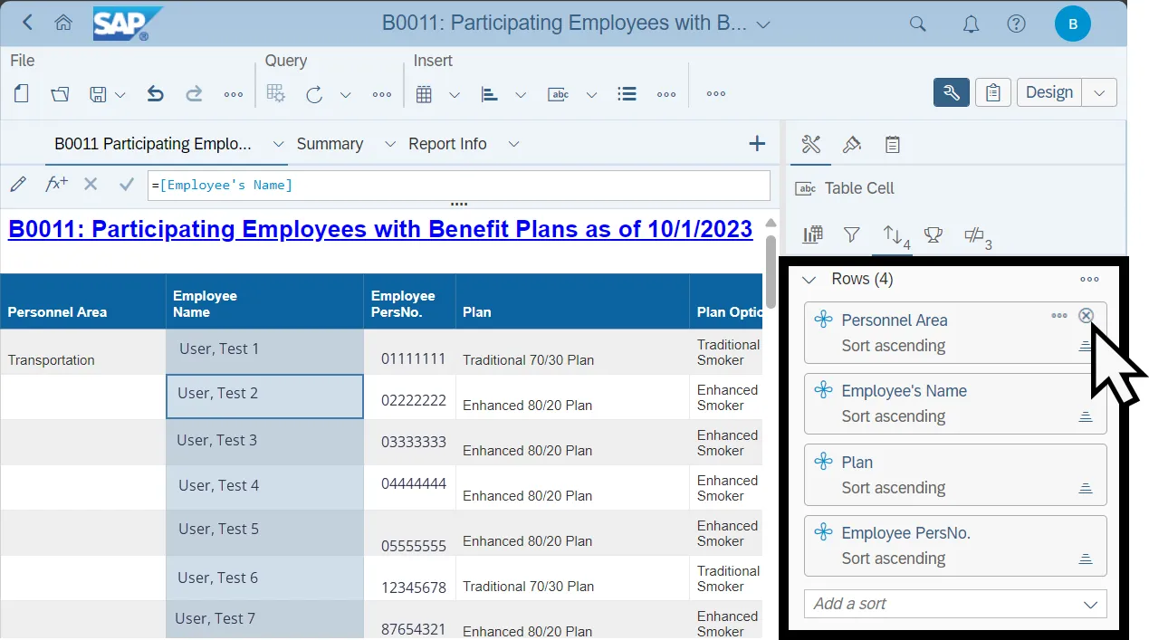 By default, data is sorted by Personnel Area, Employee Name, Employee PersNo., and Plan. This can be changed as needed.