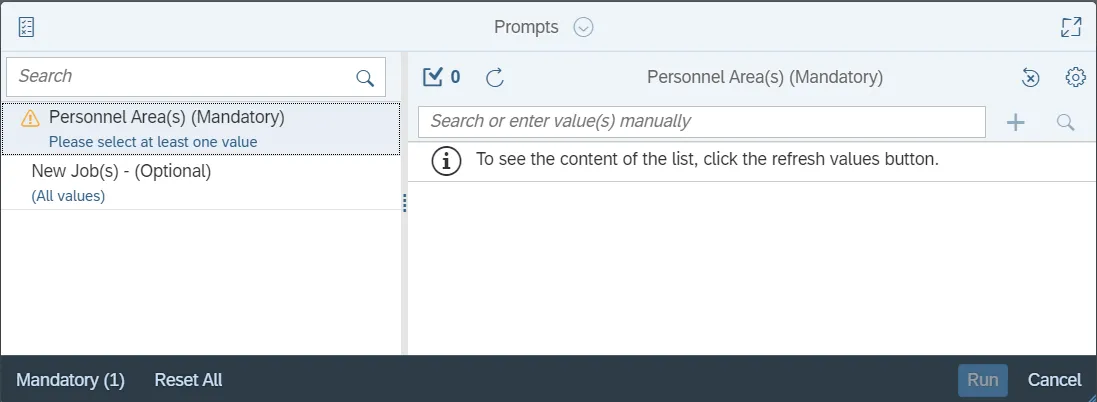 This report is generated after selecting values for the mandatory prompts. All mandatory prompts must have values selected before the Run Icon can be used to generate the report. Mandatory prompts can be identified as mandatory by the exclamation mark inside of the yellow-orange triangle, the square with the checkmark, or the display of (Mandatory). Detailed instructions for interaction with each prompt can be found on the Web Intelligence Prompt List on the OSC website.