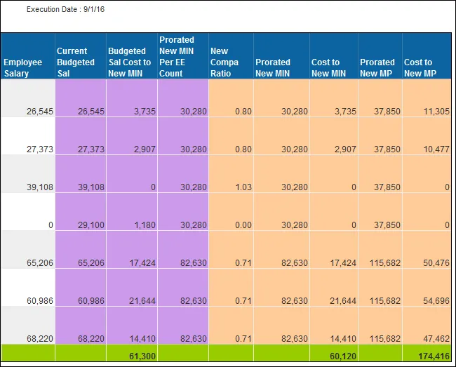 The prorated Job Min relative to employee count is calculated as: Fund % (IT9018) x Employee Count Per Position (IT1001) x New Job Min. - Compa Ratio is calculated as follows: (Emp. Salary per Fund + Prorated Cost to New MIN) divided by Prorated New MP