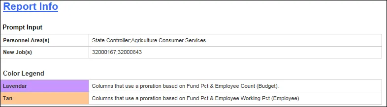 - Columns on the Detail (2nd) tab were color coded to differentiate between calculations relative to Budget vs calculations relative to Employee. The color legend appears on the Report Info tab.