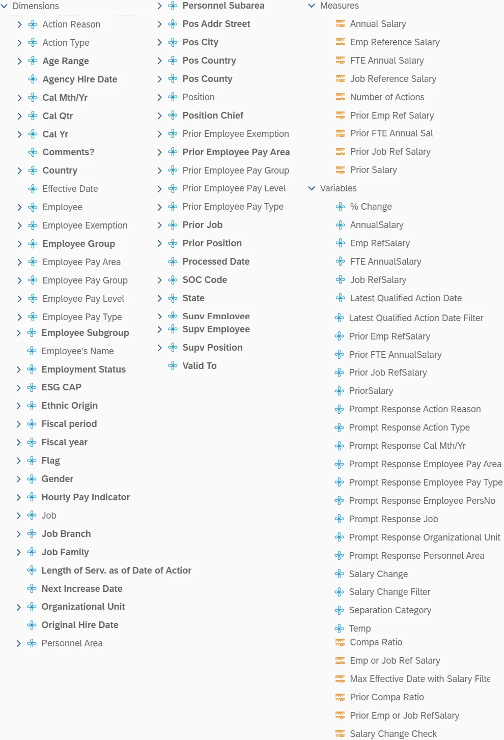 - When there are multiple salary changing actions with the same Effective Date, the Infotype 0008 change history table is reviewed to determine which salary change went with which action. However, if for some reason the number of actions does not equal the number of IT0008 change records for that same date, then we are unable to determine which action caused what salary change so the most recent IT0008 salary is shown for all actions on that day. When this scenario happens, the action records will be flagged, and the “Flag” data element (from Available Objects) will show an ‘X’ value to signify this.