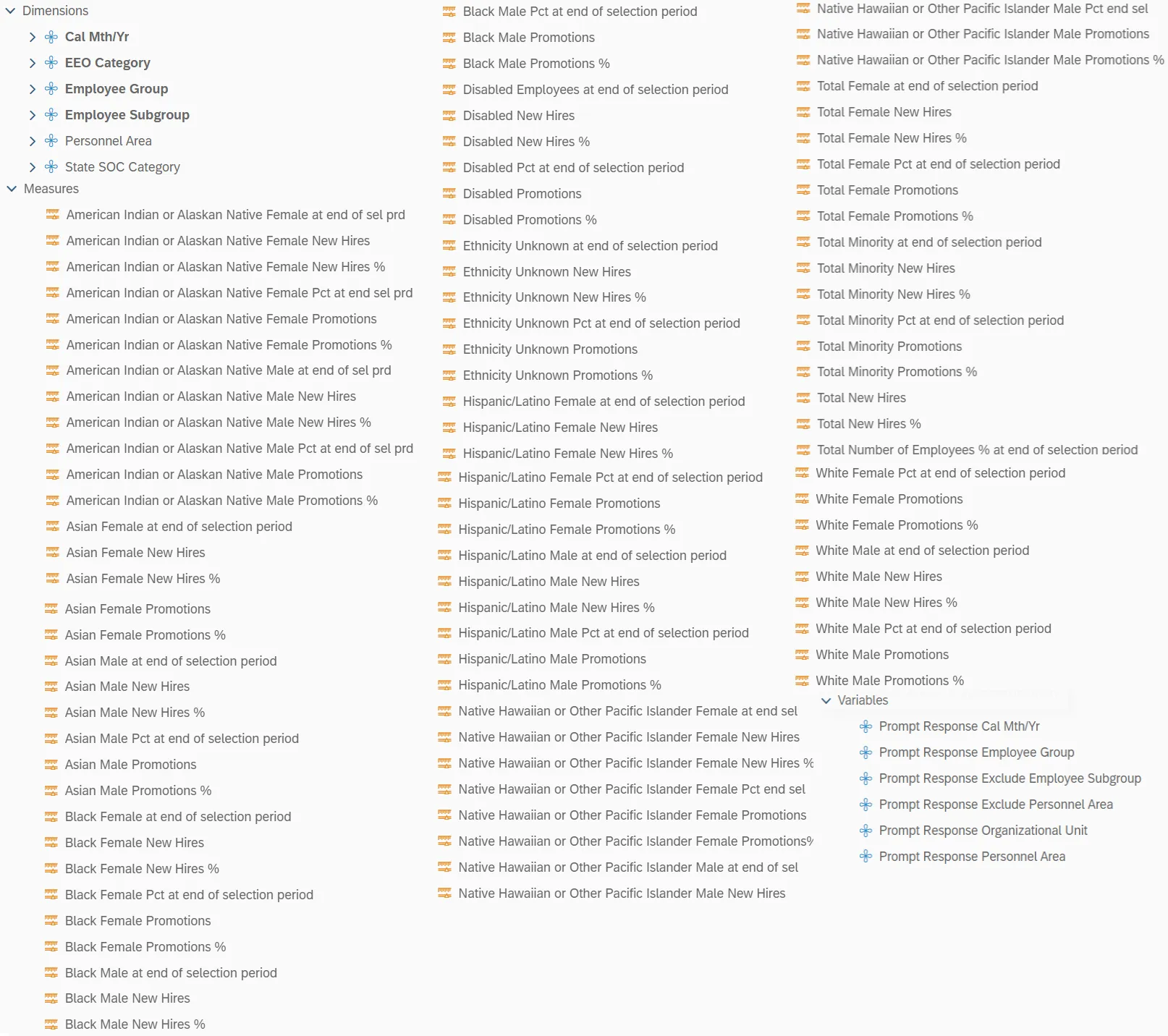 - The report is used to make comparisons by Personnel Area, SOC Category, Employees, New Hires and Promotions.