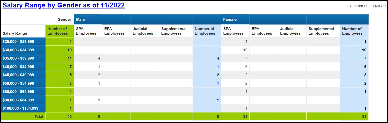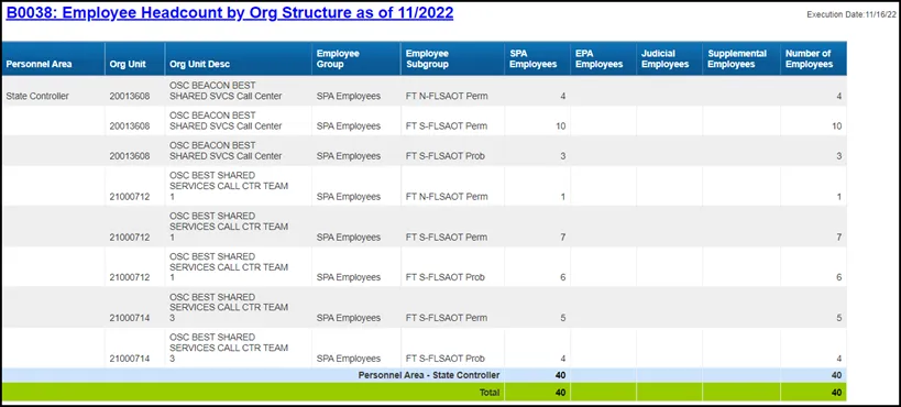 - This report counts the total number of active employees with a break down by SPA/EPA, Supplemental/Judicial as of the end of the calendar year/month specified.