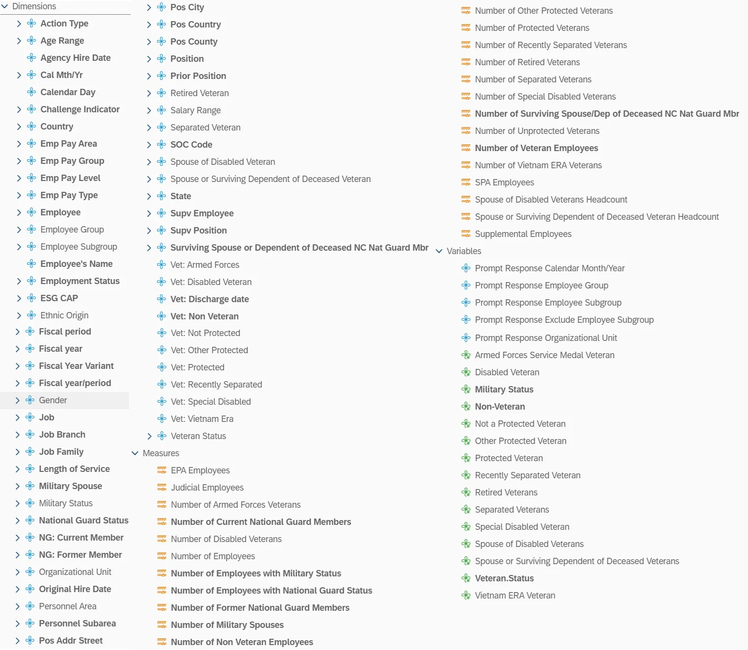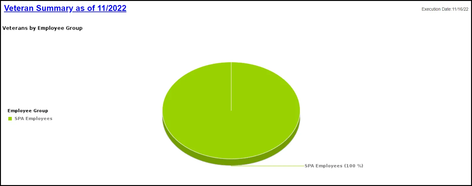 This report has filter to include in the report only the employee records that have one or more of the following flags marked: Veteran Status, Military Status, Retired Veteran, Separated Veteran, Spouse of Disabled Veteran, or Spouse or Surviving Dependent of Deceased Veteran. The flag Veteran Status is used for all other Veteran Types.