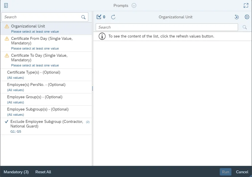 This report is generated after selecting values for the mandatory prompts. All mandatory prompts must have values selected before the Run Icon can be used to generate the report. Mandatory prompts can be identified as mandatory by the exclamation mark inside of the yellow-orange triangle, the square with the checkmark, or the display of (Mandatory). Detailed instructions for interaction with each prompt can be found on the Web Intelligence Prompt List on the OSC website.