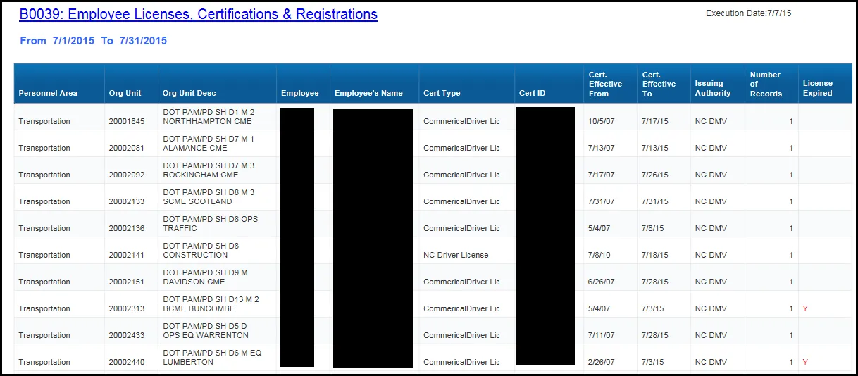 This report is used to monitor the validity of required licenses, certifications and registrations that employees need for their job functions.