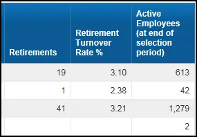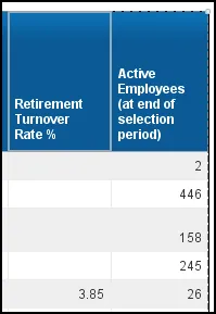 | Retirement Turnover Rate % | ([Retirements} / [Active Employees at end of selection period]) * 100 | |