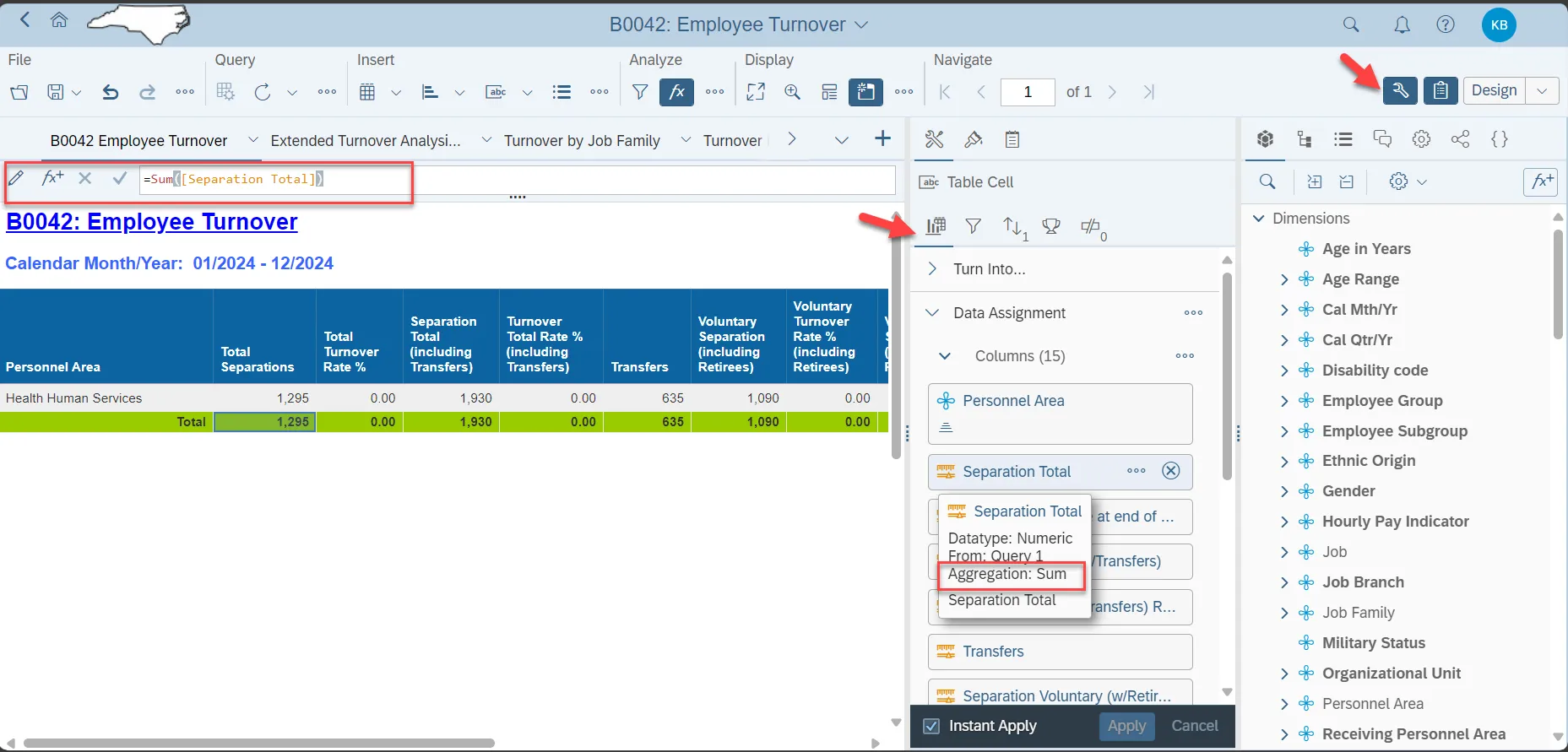 - The calculation for the various Turnover Rates and the Active Employee count related to the yellow Total row are defined using the “Aggregation” feeding panel to render accurate results.