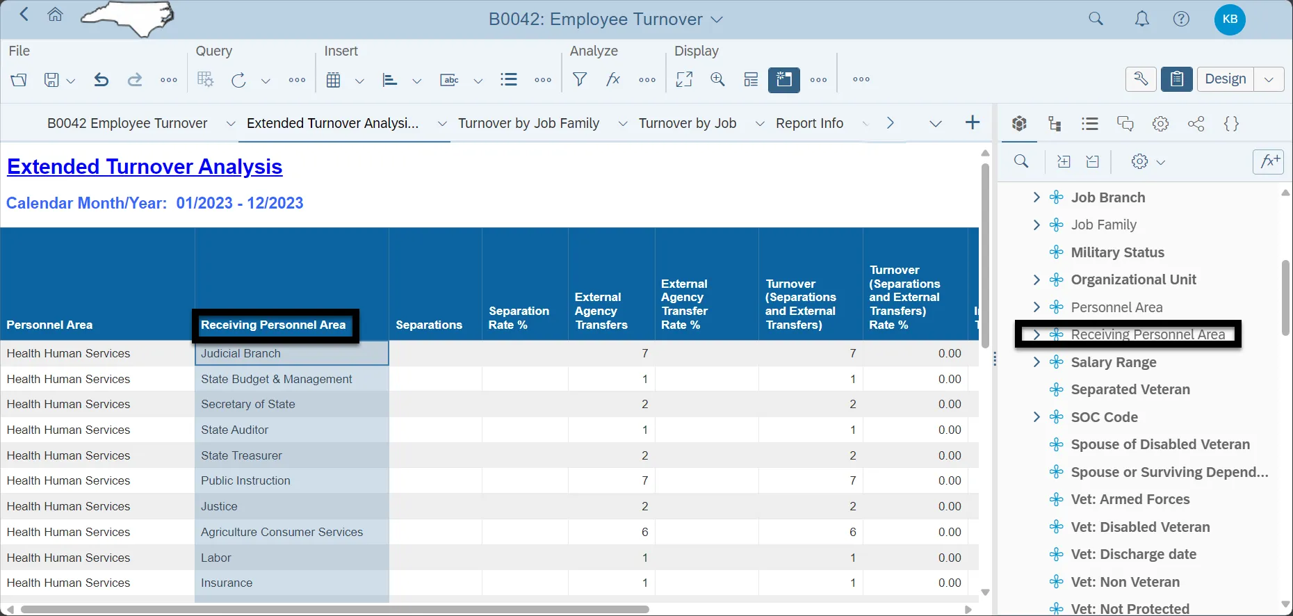 - The Extended Turnover Analysis Tab provides internal and external transfer data. It will provide the Action and rate of that action as it relates to active employees given in the time period by the user. Internal Transfers are defined as anyone who was transferred within the same agency and stayed. An External Transfer is anyone transferred outside of their current agency and Personnel Area. To investigate where the employee transferred to drag on the report Receiving Personnel Area.