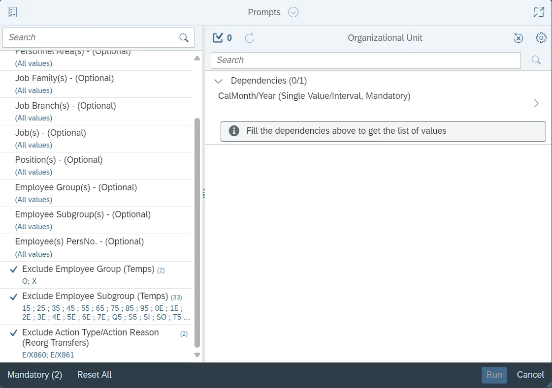 - Temporary employees are excluded by default, but this can be changed by removing the selected values on the Prompts selection for Exclude Employee Group and Exclude Employee Subgroup.
