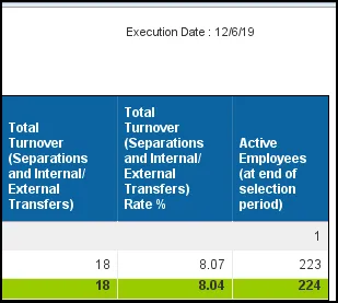 | Turnover (Separations and External Transfers) Rate % | (([Separations Total] + [External Agency Transfers]) / [Active Employees at end of selection period])) * 100 | |