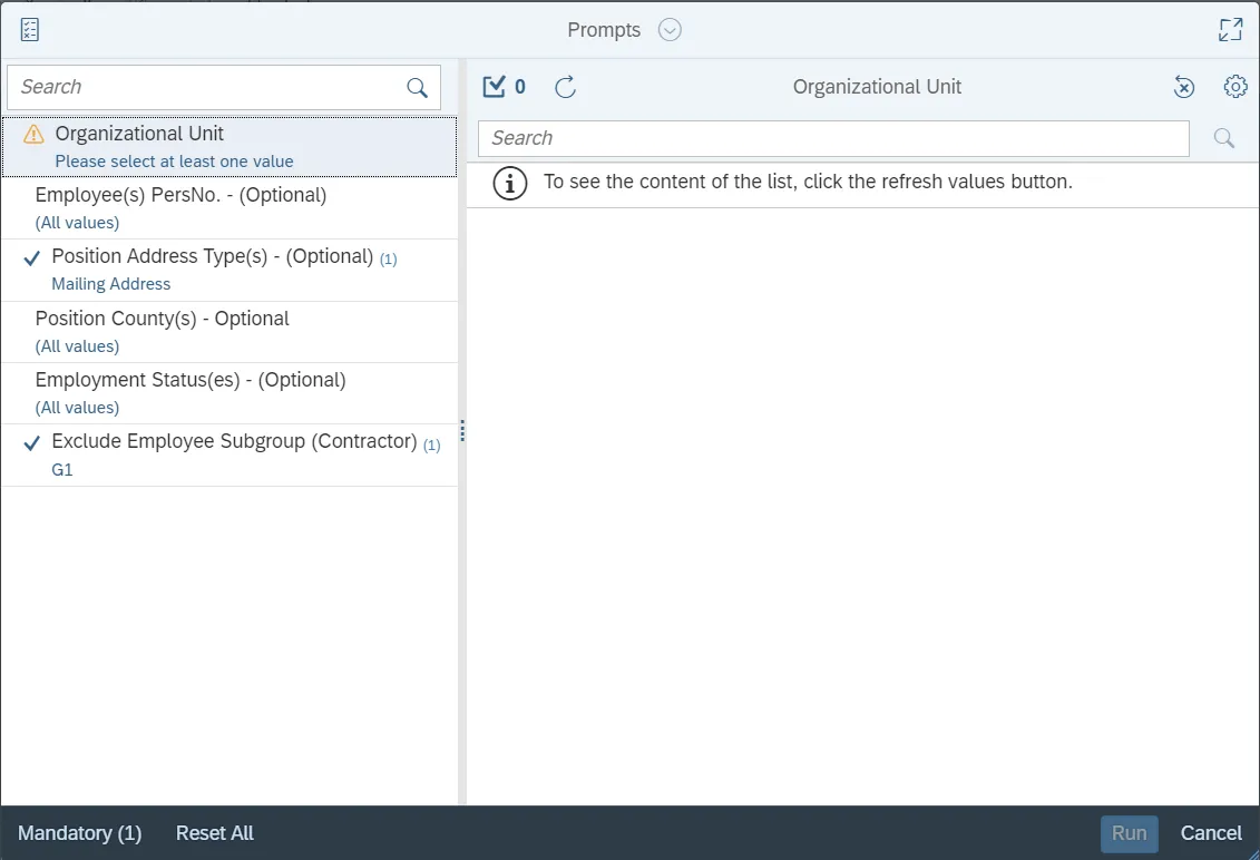 This report is generated after selecting values for the mandatory prompts.  All mandatory prompts must have values selected before the Run Icon can be used to generate the report. Mandatory prompts can be identified as mandatory by the exclamation mark inside of the yellow-orange triangle, the square with the checkmark, or the display of (Mandatory).  Detailed instructions for interaction with each prompt can be found on the Web Intelligence Prompt List on the OSC website.