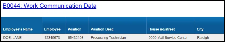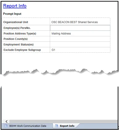 B0044 Work Communication Data Tab: The report tab is generated with a list of positions with a valid current position mailing address in the system for the organizational unit selected.
