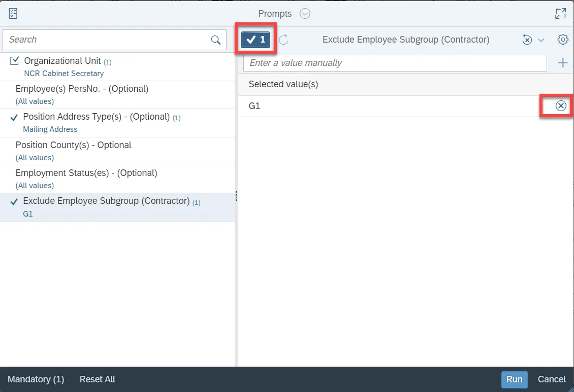 • Employee Subgroup G1 – Contractors are excluded from the report.  To include Contractors in the report, click Display current prompt answers page and click on Delete.