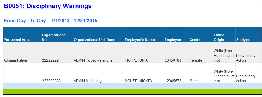The report lists all disciplinary warnings based on the prompt selections. Below is a sample of the initial layout rendered.