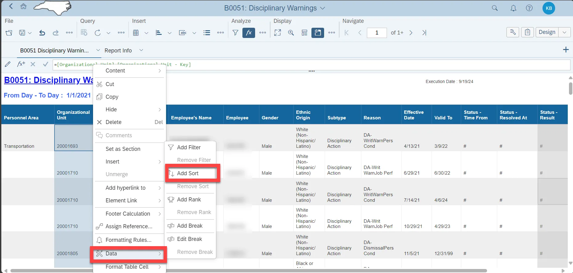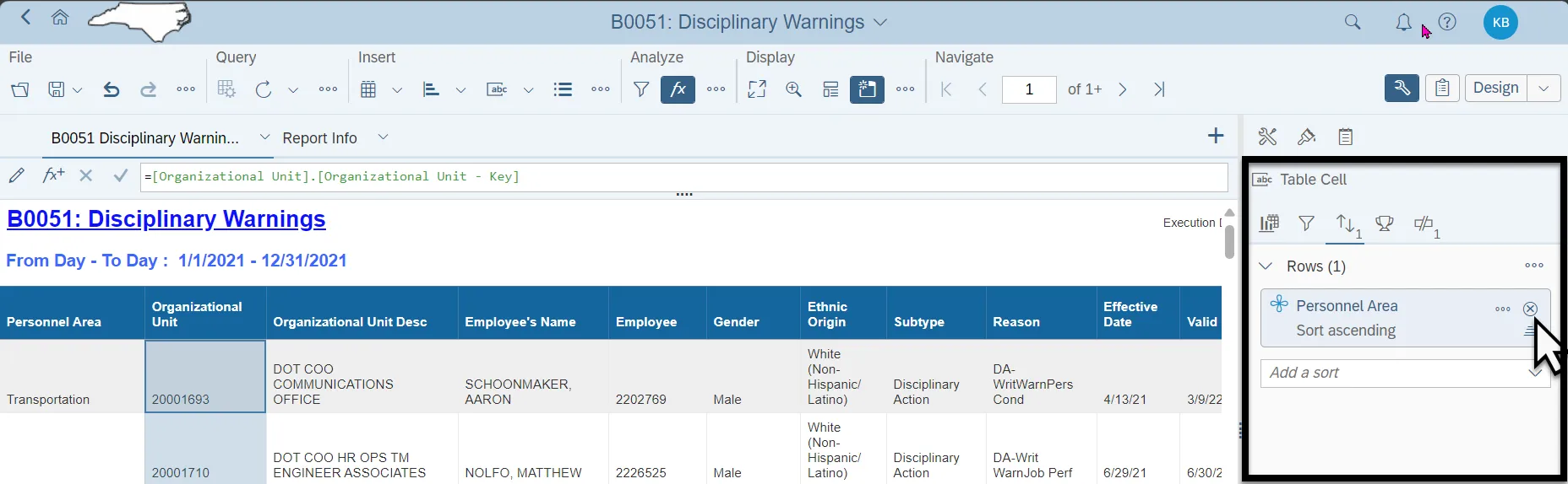 By default, data is sorted by Personnel Area. (This can be changed as needed).