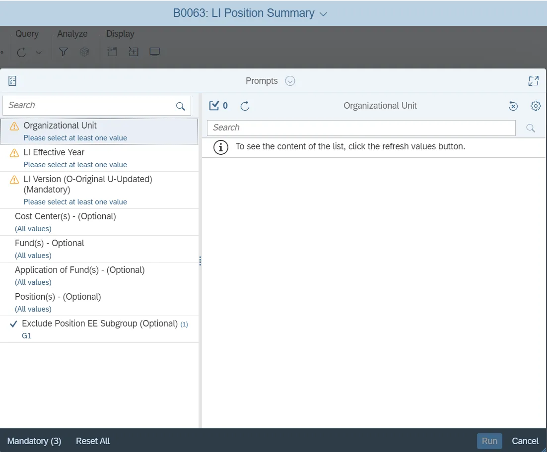 This report is generated after selecting values for the mandatory prompts.  All mandatory prompts must have values selected before the Run Icon can be used to generate the report. Mandatory prompts can be identified as mandatory by the exclamation mark inside of the yellow-orange triangle, the square with the checkmark, or the display of (Mandatory).  Detailed instructions for interaction with each prompt can be found on the Web Intelligence Prompt List on the OSC website.