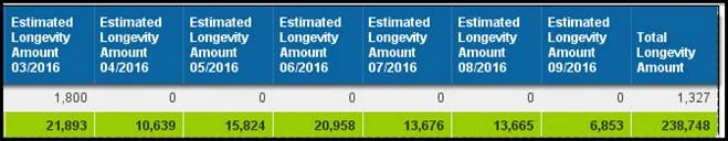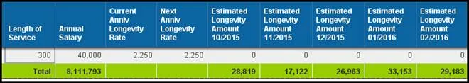 • The report displays a column for each month projected out for 12 months from the date the report is requested. The longevity amount for each employee will display in the column for the month in which the longevity is due to be paid.
