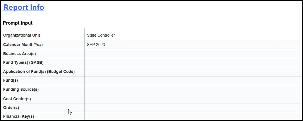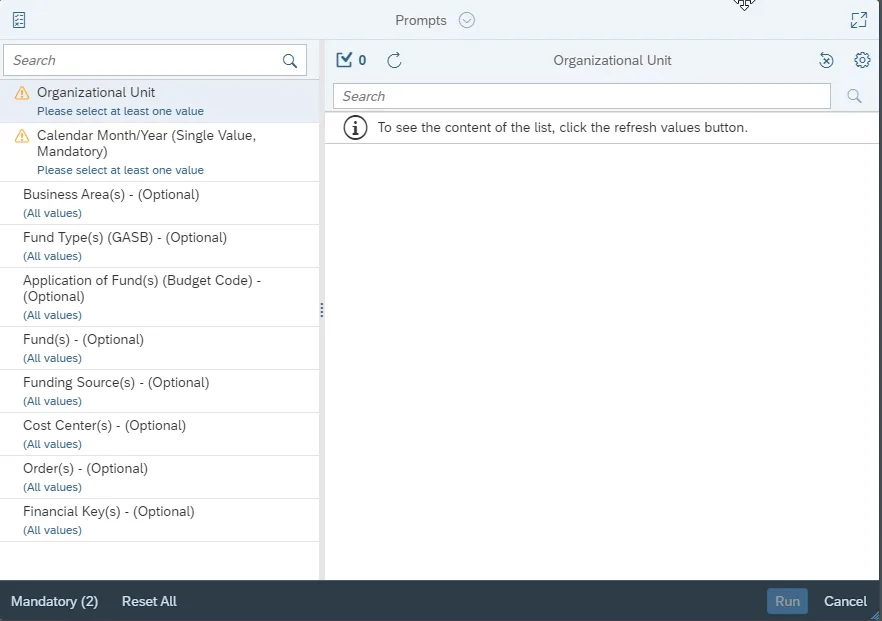This report is generated after selecting values for the mandatory prompts. All mandatory prompts must have values selected before the Run Icon can be used to generate the report. Mandatory prompts can be identified as mandatory by the exclamation mark inside of the yellow-orange triangle, the square with the checkmark, or the display of (Mandatory). Detailed instructions for interaction with each prompt can be found on the Web Intelligence Prompt List on the OSC website.