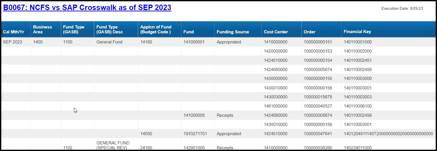 This report shows the components of the North Carolina Financial System (NCFS) cost distribution that have been cross walked to the SAP system. It shows the budget code (SAP fund application), Fund Type (NCFS -GASB), SAP Fund, Funding Source, Cost Center, Order Number, and Financial Key. The NCFS to SAP crosswalk information will be included in this report if position(s) have been budgeted for the cost center in SAP.